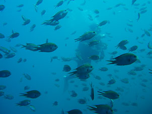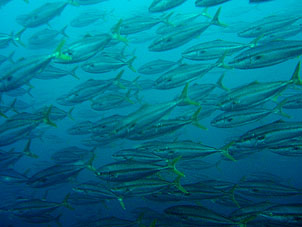 エントリーするとさっそくマアジの大群が。北側にはイサキも大群で降ってきます。上のほうではニザダイも大きな群れとなって迫力のシルエット。そして今日のハイライトはワラサの大群です。ワラサ大群が目前をガンガン泳ぎます。みんな目前のワラサの壁を見ながら大慌てでカメラのスイッチを入れたりでした。サク根のスピード感あふれる雰囲気はやっぱりいいですね〜。