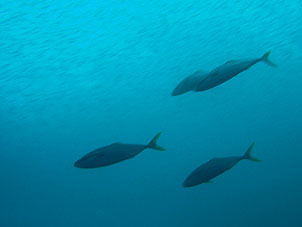 かわりに潜ったのは弁天島。外海に比べればずいぶん気が楽な海況です。海の中は静かそのもの。潜降してすぐにキビナゴ大群が目に入ります。海の中を島の外海側へ向かいます。ここはあいかわらずのソフトコーラルの見事さ。スズメダイやイサキの子も群れています。浅いあたりにはキビナゴがいっぱい!そこへイナダやカンパチが現われて賑やかな水中になりました。