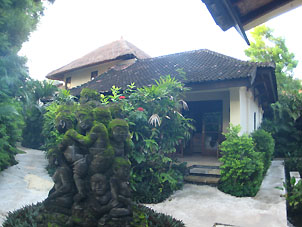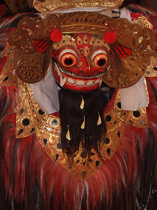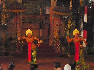 朝はバロンダンスが見られるとのことでした。 バリ島らしい音楽をバックに獅子舞みたいのやら女の人やらサルやらがでてきます。 けっこう笑いの場面もあるんです。 それにしても女の人の踊りはスゴイです。 手や体の動きもすごいけど「あの目」は見とれるしかありませんでした… |