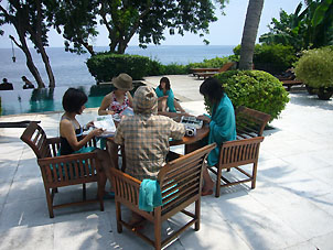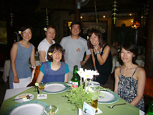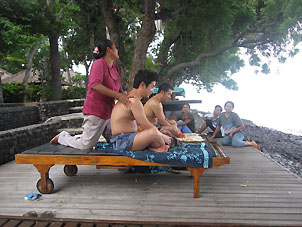 マッサージ ミンピリゾートではマッサージを頼むこともできます。専用のマッサージルームもあるようです。 それとは別に、近所の人たち(女の子、たまに女の人)が声をかけてきます。 「マッサージ、キモチいいよ」 さっそくメンバーのお1人が交渉していました。 私はフーンくらいに思っていたのですが、次第に気も引かれて値段も安いしおもわずやってもらうことにしました。 15万ルピア だったかな。 日本円なら約1,200円。 Akiくんは若い女の子にマッサージしてもらっていたはずなのにいつのまにかオッカサンみたいな人に代わっていました。 なぜでしょうね?? 自分は最後まで代わることはありませんでした。 (別にいかがわしい内容のマッサージではありませんが) 満足、満足 |