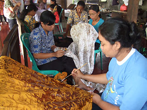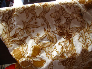 陸上も楽しいバリ島。 もちろん観光もしてきました。 インドネシアで有名なバティック染めのお店にも行ってきました。 この染物は工程で蝋で模様を書いて何度も染めたりするんですね。 |