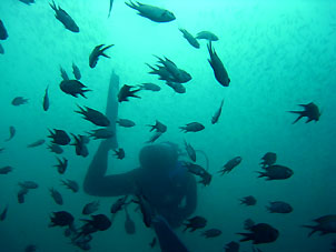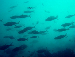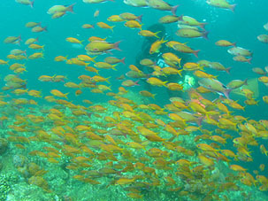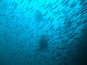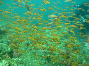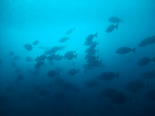 今年の初夏、ホームの伊豆のみならず伊豆諸島までも海のコンディションが上がってきません。 水温は上がらず、透明度も今ひとつ。 どうしたわけか、今回の日程の時点では鹿児島の近場の海も同じような状況にありました。 水温は今回21〜26℃。その前に潜った伊豆(低い場所は16℃台)に比べれば楽勝に温かいですけどね(笑) 透明度もパッとしません。 でも魚影はさすが! 千貫瀬ではイサキの大群、ニザダイの大群、タカサゴ大群、根頭の凄い数のキンギョハナダイ大群は健在、千貫というだけのことはあります。 そのあとに走った久多島も透明度は10m前後とこの時期としてはいまふたつ。でも目が回るほどのキビナゴ大軍、ハマフエフキの群れ、ニザダイ群れ、カンパチの群れ、なんだかやたら登場のエイたち、そしてこの時期ならではのオグロメジロザメ軍団。 物凄い数の魚たちの中を泳いできました! |