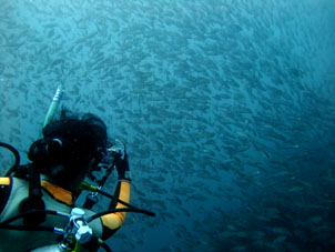 ・今日は西伊豆にはあまりうれしくない南西の風、昨日からのメンバーの皆さんだったのでいつもと違ったパターンにすることにしました。 以前はお気に入りのボートスポットの伊東、最近でも年に1回くらいは行ったりします。 土肥からはコンビニに寄りながらで約1時間半で到着。同じ伊豆でも東側は海岸沿いの賑やかさにいつも驚きます。田舎な風情が良い西伊豆と、ちょっぴり垢抜けた賑やかな東伊豆。 さて、海はほぼ凪、潮はそこそこ流れていました。まずは期間限定の五島根へ。 ロープ沿いに潜降して行くと「きれい!」数日前の感動の土肥サク根と同じ感じでです。 水温はすっかり高くボーっとしてきます。たまに来る23℃くらいの冷たさの水がホッとします。 潮の上にエッチラと進むとイワシかなんかの子供の大群が登場。そして高い根の前はイサキワールド!根から離れて誘うと私たちの間に割り込む凄い数の大群。青い中層で何度も何度も魚群遊び。楽しかった〜! 後半は浅い根のトップでキンギョハナダイの大群やメジナを見ながら過ごしました。 2本目はレギュラーポイントながらダイナミックな白根へ。水は多少落ちましたが、10m〜15mは楽に見えているので問題なし。こちらもすっごい魚影!イサキ、タカベ、ネンブツダイはどれも超大群です。そこへワラサもウロウロ。ソフトコーラルも本当に見事です。 伊豆の海が楽しい季節ですね!