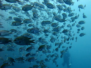 ・着々と台風は北上しつつありうねりも出始めています。東伊豆や南伊豆でもうねりや強風による時化でクローズのポイントも多かったようです。 西伊豆でもさすがにうねりは届いていますがまだ大丈夫。とりわけエントリー場所から12〜15mの水深のある安良里のボートポイントではマイナス面の影響はほとんど感じることなくもぐる事が出来ました。 もちろん海中の楽しさもあいかわらず。魚影は今日も見事でしたよ!スズメダイ、マアジの大群に主のような(主にしては多すぎですが)マダイ親分は今日も凄い顔でホバリングしてました。オオモンカエルアンコウやメジナの群れ、見事なキンギョハナダイもバッチリでした。 そう言えば、今日はなんだか水がきれいでした。 2本目の御黄金なんかは浅場はきれいで感動しちゃいました。こちらはメジナの大群やネンブツダイの幼魚の大群など。k 昨日、今日のメンバーの方たち、このコンディションもあって安良里が続きましたがポイント3つ潜り変化が出て楽しかった!との感想をいただきました。 |