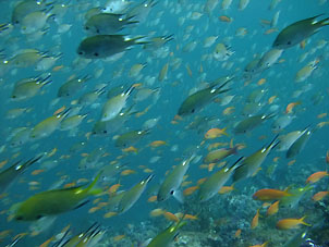 と思ったらそこから飛んだ南の根はさらに見応え十分。マアジやムロアジ、スズメダイ、大マダイ、根頭のキンギョハナダイ大群が入り乱れて「極楽」のようでした。