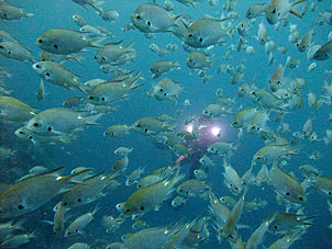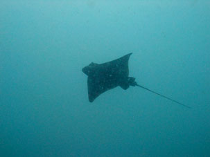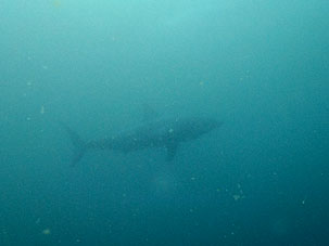 ・晴れて暑いくらいの陽気だった昨日と打って変わって雨降りの1日でした。気温もあまり上がらず20℃手前、ちょっと肌寒かったですね。 でも安良里のボートは船に乗るまで雨も当たらないし、温まれるお湯もあるし助かります。 この時期の安良里のボートポイントではやはりトビエイが気になります。水は昨日の雲見ほど良くはなっていませんが浅い濁っているあたりで7〜8mの透明度、下のほうにはきれいな水もきていました。でも全体的に不自由も無く楽しめました。 さて、季節の名物トビエイは群れとは行きませんでしたがワンダイブの間に何回も単体〜2匹で登場。なんだかたくさん見たような気になりました。 沖の根名物マダイ軍団も健在、イシダイやスズメダイ群れも元気で賑やかです。まだ魚が多くなる前の時期でこれだけ賑やかなら十分満足です。2本目は中層でスズメダイの群れでさんざん遊びました。そこへトビエイや不敵な顔のマダイも混じったり。 そんな感じで浮いていたら突然の意外な遭遇が! メジロザメでした! 大きさは2.5mくらい。当然のことながらまったく予想していなかったので近くに来たときの写真やビデオが残せなかったのが残念。 浅い薄濁りのあたりを悠然と通り過ぎる姿は迫力満点でした。 神子元以外の伊豆のポイントでこの大きさのメジロザメは珍しいですよね。 これだから海は面白いですね。