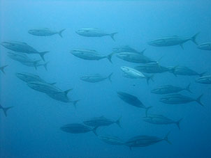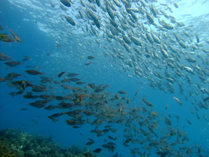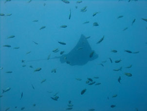 ・3連休の中日、さすがに賑わっていました。 今日は安良里ボート。天気もガツンと晴れてとっても暑く、海は静かでした。 潮の流れはほとんど無い中エントリー。海に顔をつけると、青い! 水深5〜7mくらいまでは青くてきれいな水です。水温は27℃!一気に夏の潮です。 10mより下に行くと多少暗い潮になりますが、それでも透明度は10m以上見えていて問題なし、しかもやはり外気温がとっても高いので気持ちよい23℃前後。昼近くの2本目には水中は全体的に白っぽく透明度が落ちましたが、朝一はやはりいいですね。 これだけの高い水温になっても今日もトビエイ×3匹が姿を見せてくれました。名物の大きなマダイ軍団、スズメダイの大群と、今日はキビナゴの大群が走り回り、それを追うカンパチの編隊とワラサ群れが泳ぎまわっていました。 後半は沖の根の一番浅い辺りで青い水に包まれ、メジナ群れやスズメダイの大群の中に入って至福の時間を過ごしてきました。 日々変化しながら今日も夏らしい楽しい海でした。