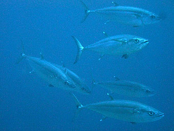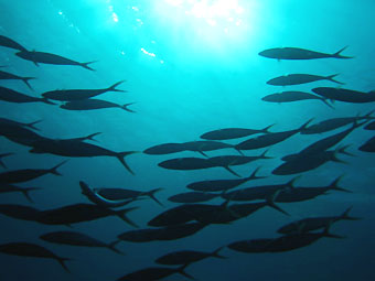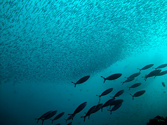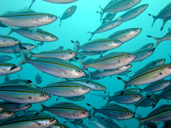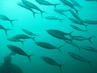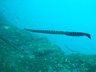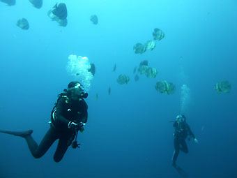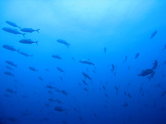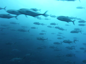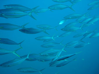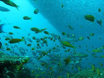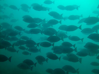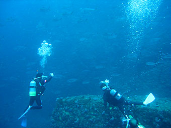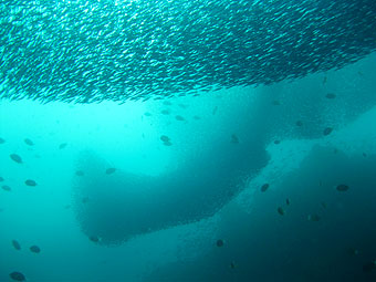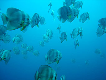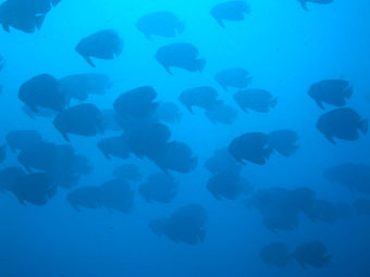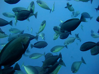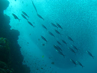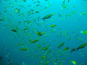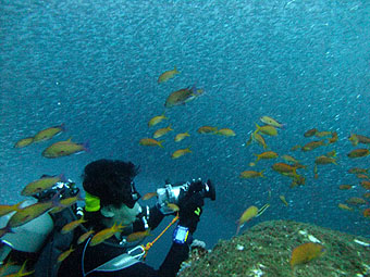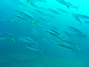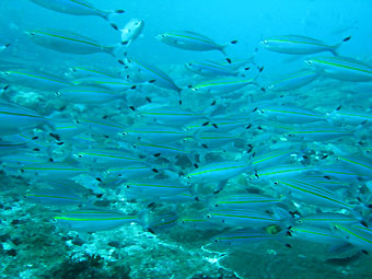 昨年ここで潜ったときにも水面は赤い水で覆われていましたが、少し潜るとそこそこ見える透明度になることがわかりました。 そして、潮が動けば一気に魚達がわき上がって来たことが印象的なところなのです。 今回は潮はゆっくり。赤い水もありません。飛び込むと、若いツムブリたちがお出迎え。ず〜っと我々についてきます。思ったより潮はまったりだったのでゆっくり思い思いにフィッシュウォッチング。 そうこうしていると、突然(ほんとうに突然でした)いきなり現れたツバメウオの大群。 ど、どこにいたんですか〜? そう思わせるくらいの数の大群でした。 |