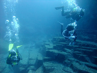 風が当たらない島の南側を魚群探知機と陸上景観を見ながら飛び込む場所を探します。 船からハンマーヘッドも見えた、沖に張り出した岩の近くで飛び込みます。地形は大きく落ち込んだりする巨岩の連続。でも潮の具合か岩肌には何もついていなくて行ってみれば殺風景。 岩を回り込むと岩が段々になる場所があります。 どこかの島の「遺跡ポイント」みたい(笑) そのあたりから、タカサゴ、ウメイロモドキ、カメ、ニザダイなど魚が一気に増えてきます。なんの変哲もないゴロタ地帯なのですが。 黒島、なかなか不思議な海でした。 |
