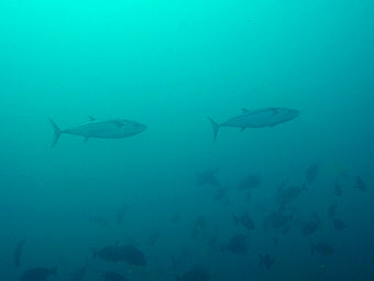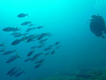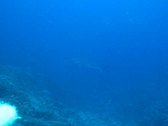 北西からの風で湯瀬も波が高い状態… でも南側の岩の側ならエントリー、そして大事なエキジットも問題なくできそうです。 岩の際まで船が近づいたところでいっせいにエントリー! ツアー1本目から湯瀬。目に飛び込むのは湯瀬の岩肌。 今回も湯瀬に来れたんだなぁ。 そこから、ゆっくりといつもの沈み瀬へと向かいます。潮流はゆっくりと南から北。戻らなくてはならないのでゆっくりの潮は助かります。 さっそく出てきたのはメジロザメ。我々のやや後方から様子をうかがうかのように接近します。 その後は、名物、ギンガメアジ群。 あいかわらずの速さ。目前を右から左からスゴイ速さで泳ぎ回ります。 |