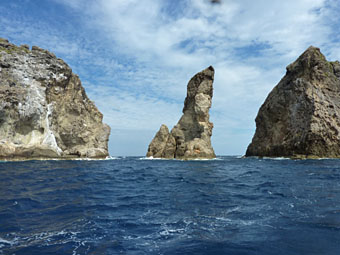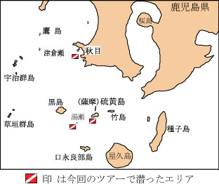 湯瀬で潜った後は、「さてどうしましょう」 今日は時間もあるし、ご希望の方で3ダイブ目を。でもここで休憩するのはあまり穏やかではないし… では、東に見える「黒島でも行ってみる?」と船長さん。 ちなみに薩摩硫黄島のある三島村は硫黄島、竹島とその黒島を合わせて三島村。でも黒島ってなぜか行く機会がないんですよねぇ。 良い機会ですね。行って見ましょう! |