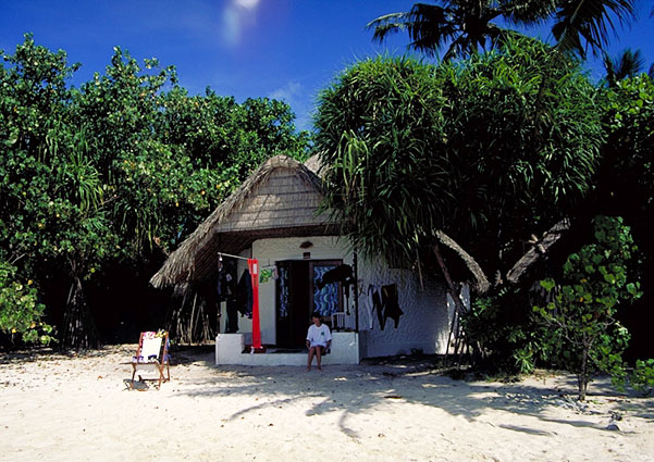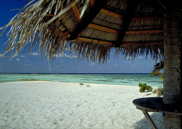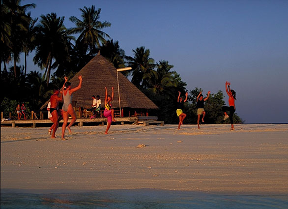 | 陽射しのつよい真昼のビーチ。日陰は欲しいし海は見ていたいし。 (マヤフシ) | よくシーサイドコテージというのはあるけどここはオンザビーチコテージだ。 (バタラ) | 夕方の浜辺で始まったエアロビクス。この後、参加者が増えていった。 (ランナリ) |