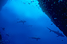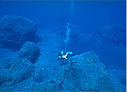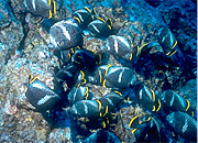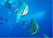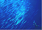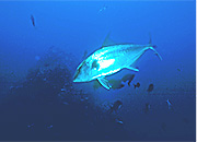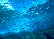 なんというかソーフは不思議なところだ。けっこう狭い範囲にさまざまな種類の魚達がひしめきあっているといった印象なのだ。そして、多くの魚達が私達ダイバーに寄ってくる。ツバメウオ、カッポレ、ヒレナガカンパチ、オニカマス、サワラ、そしてメジロザメ。こいつらが近寄ってくる主な連中だ。メジロザメに関しては近くでキハダマグロのはえ縄漁をしていたせいか多少ザワついていて怖いものがあった。それにしてもこの魚達は人間を知って来るのか知らずにくるのか。 |